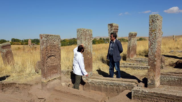 Prof. Dr. Karahan, gazetecilere yaptığı açıklamada, bölgede yaptıkları çalışmalarda, depremlerin izlerini taşıyan yeni mezar taşlarıyla karşılaştıklarını söyledi.