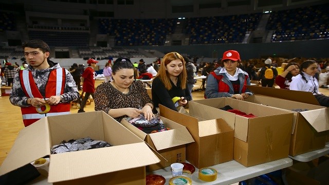 Yardım toplama merkezi olarak tahsis edilen Haydar Aliyev Kapalı Spor Merkezi'nde de yardımların ardı arkası kesilmiyor. Merkezde, eşyaların ayrılması ve taşınması işinde yüzlerce gönüllü çalışıyor.
