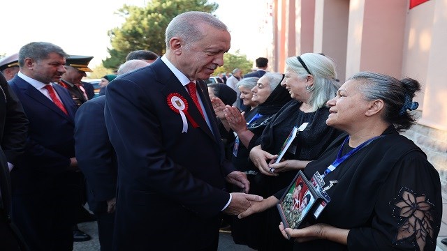 Şehit ailelerinin tek tek elini sıkan Erdoğan, "Tüm şehitlerimizin inşallah mekanları cennet olsun." ifadelerini kullandı.