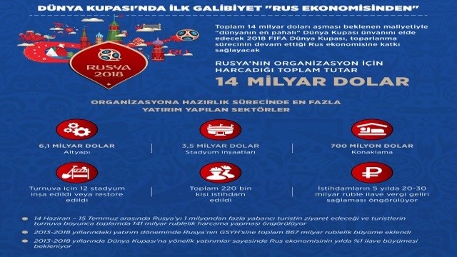 Eski Rusya Başbakan Yardımcısı Arkadiy Dvorkoviç, bir süre önce yaptığı açıklamada, Dünya Kupası’na yönelik yatırımların olmaması halinde yaptırımlar nedeniyle zor günler geçiren ve ilk çeyrekte yüzde 1,1 büyüyen Rus ekonomisinin büyüme kaydetmeyi başaramayacağını söylemişti.