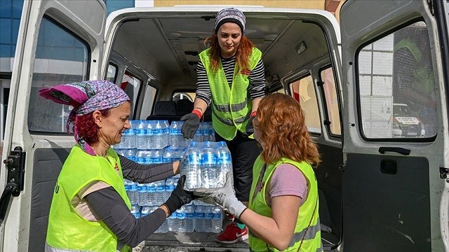 Yardım malzemelerini depremzedelere ulaştıran kadınlar, ihtiyaç durumunda da aşçılara destek vererek yemek hazırlıyor.