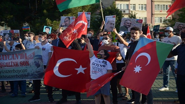 Kent merkezindeki bir alışveriş merkezinin önünde toplanan dernek üyeleri, taşıdıkları Azerbeycan ve Türk bayraklarıyla bir süre yürüdü.