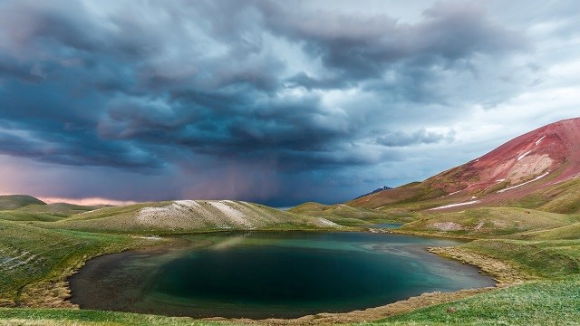 Gölün etrafı kırmızı renkteki tepelerle ve yeşil çimenlerle çevrili.
