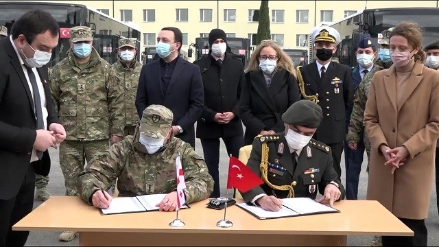 Bakan Garibaşvili, yaptığı konuşmada Türkiye'nin, Gürcistan ordusuna 35 özel otobüs ile 12 zırhlı iş makinesini hibe ettiğini belirterek, "Bu, Türkiye ile Gürcistan arasındaki son derece başarılı iş birliğin güzel bir örneği." dedi.