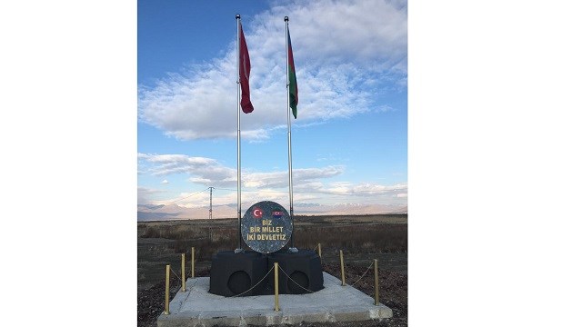 Türkiye ve Azerbaycan bayraklarının dikildiği anıtın üzerine, "Biz Bir Millet İki Devletiz" yazıldı.