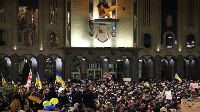 Başkent Tiflis'te gece saatlerinde Parlamento'nun önünde toplanan binlerce gösterici, ülkelere, zor günler yaşayan Ukrayna halkına yardım etme çağrısında bulundu.