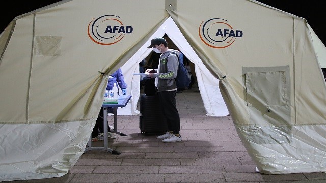 Otobüslerden 5'erli gruplar halinde ve sosyal mesafeyi koruyarak inen yolcular, AFAD ve UMKE ekiplerinin yurt bahçesinde kurduğu çadırda sağlık kontrolünden geçirildi.