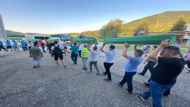 Dün Visoko'dan yola çıkarak Potoçari'ye getirilen ve gece eski fabrika binasında kalan tabutların mezarlığa taşınması sırasında duygusal anlar yaşandı.
