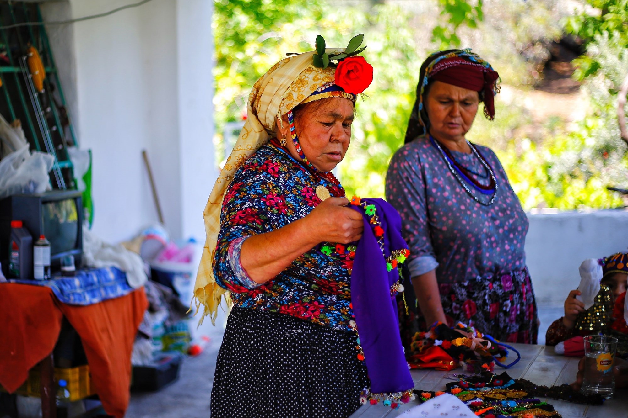 Muğla'nın Milas ilçesi Çomakdağ köyünde kadınlar, rengarenk giysileri, altın takıları ve başlarına taktıkları çiçeklerle geleneklerini yaşatmaya çalışıyor - Kadınların günlük yaşamdaki giyim kuşamları, yöreyi ziyaret edenlerin ilgisini çekiyor.