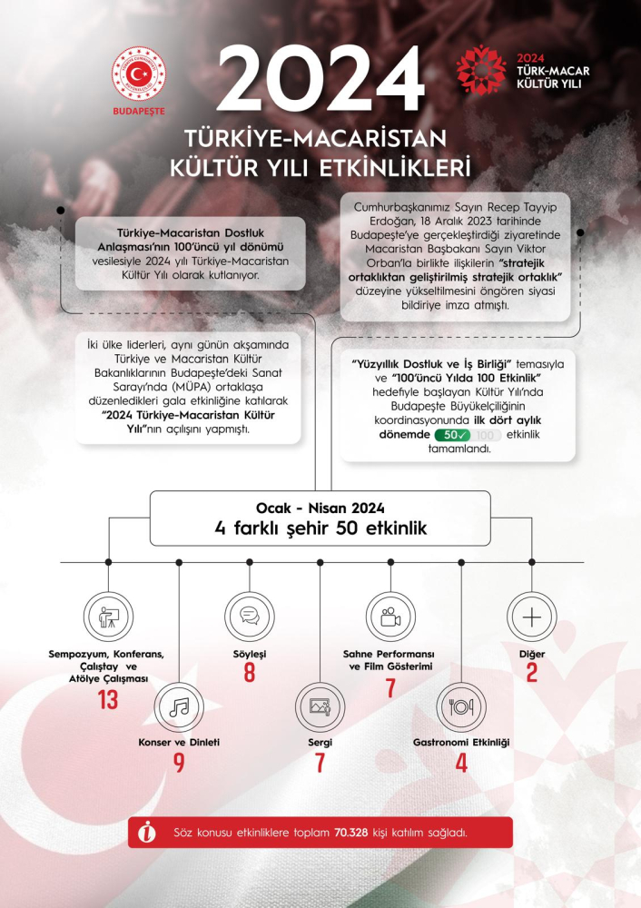 Yılın ilk dört ayında Türk kültürünü, sanatını ve mutfağını tanıtmak üzere Macaristan’ın dört farklı şehrinde düzenlenen 50 etkinlik toplamda 70 binden fazla kişiye ulaştı. Başkent Budapeşte’nin yanı sıra Veszprem, Szeged ve Tokaj şehirlerindeki konser, tiyatro, sergi, konferans ve söyleşi gibi farklı etkinlikler gerçekleştirildi.