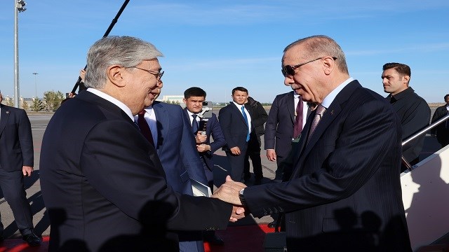 Cumhurbaşkanı Erdoğan'ı, Nursultan Nazarbayev Uluslararası Havalimanı'nda, Kazakistan Cumhurbaşkanı Kasım Cömert Tokayev karşıladı.