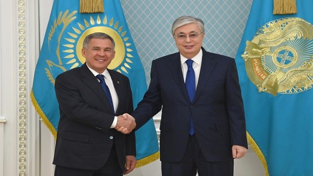 Tokayev, temaslarda bulunmak üzere başkent Astana’ya gelen Tataristan Cumhurbaşkanı Minnihanov’u Cumhurbaşkanlığı Sarayı Akorda’da ağırladı.