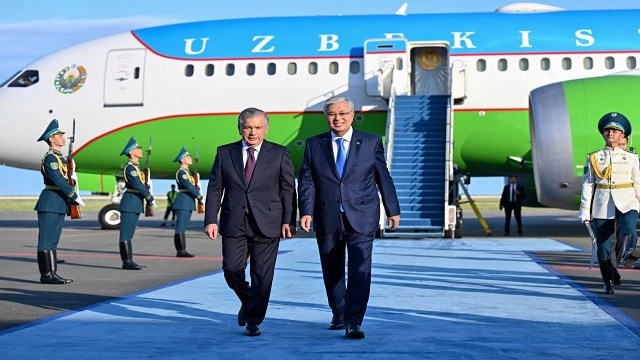 Kazakistan Cumhurbaşkanı Kasım Cömert Tokayev, Özbek mevkidaşı Şevket Mirziyoyev’i Astana Havalimanı'nda resmi törenle karşıladı.
