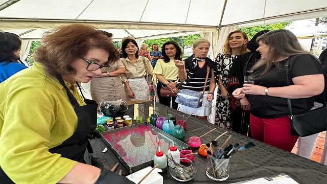 Belgrad Büyükelçisi Hami Aksoy'un eşi Canan Parmaksızoğlu Aksoy'un davetiyle büyükelçilik konutunda düzenlenen etkinlikte, ebru, hat, ağaç baskı gibi geleneksel sanatlar tanıtıldı.