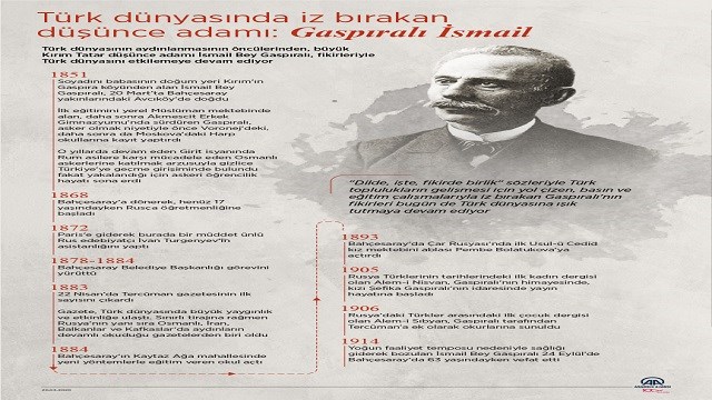"Dilde, işte, fikirde birlik" sözleriyle Türk topluluklarının birleşebileceği fikrinin öncülerinden, basın ve eğitim çalışmalarıyla iz bırakan Gaspıralı'nın düşünceleri bugün de örnek alınıyor.