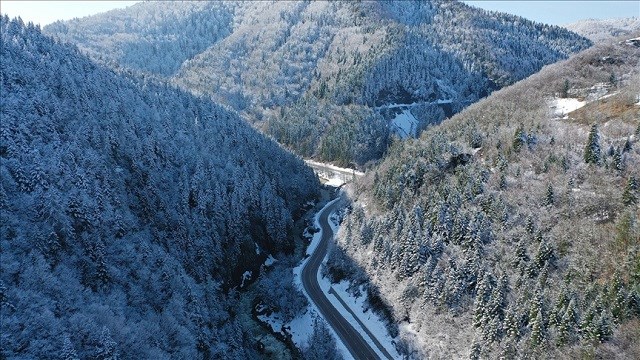Bölgede karla kaplanan ormanlar, güzel manzara oluşturdu. Kış mevsiminin tüm güzelliklerini sergileyen dağların beyaz örtüyle buluşması, havadan görüntülendi.